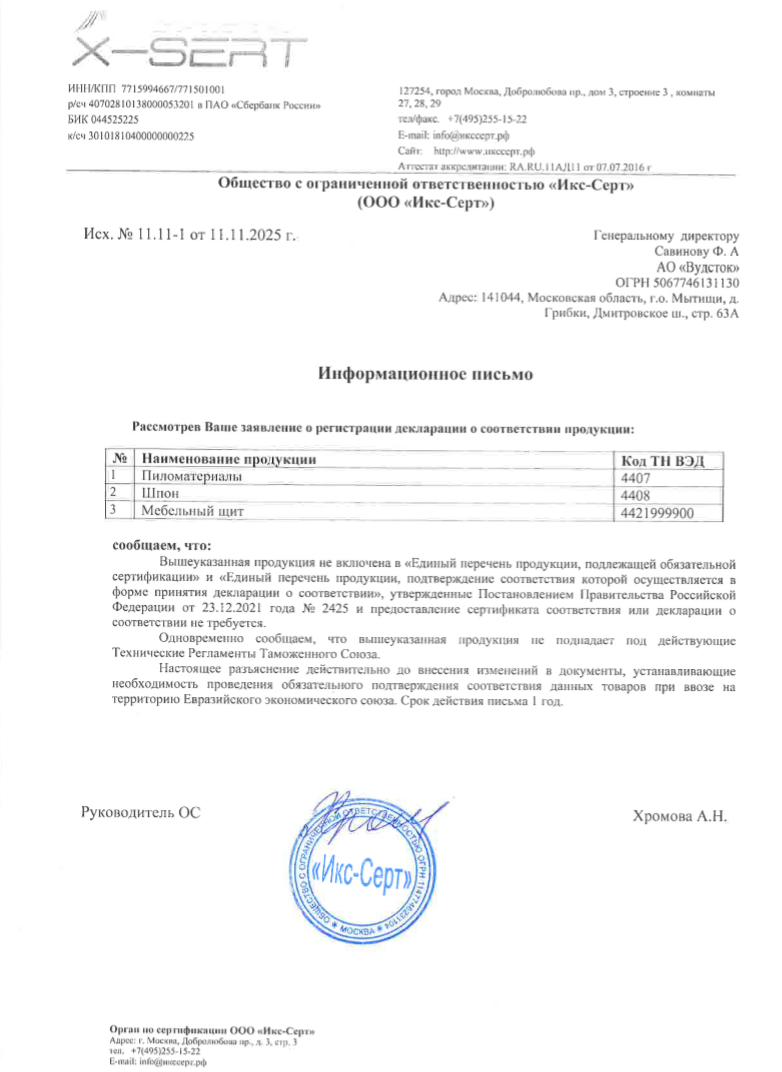 Так же, информацию о принадлежности к объектам сертифицирования можно получить из Информационного письма от аккредитированного органа по сертификации продукции. В письме упоминается Постановление Правительства Российской Федерации от 23 декабря 2021 г. № 2425 и Решение Комиссии Таможенного союза от 7 апреля 2011 г. № 620 (с изменениями на 15 октября 2017 г.), в которых Шпон, Пиломатериалы и Мебельный щит не включены в перечень продукции, подлежащей обязательному подтверждению соответствия.