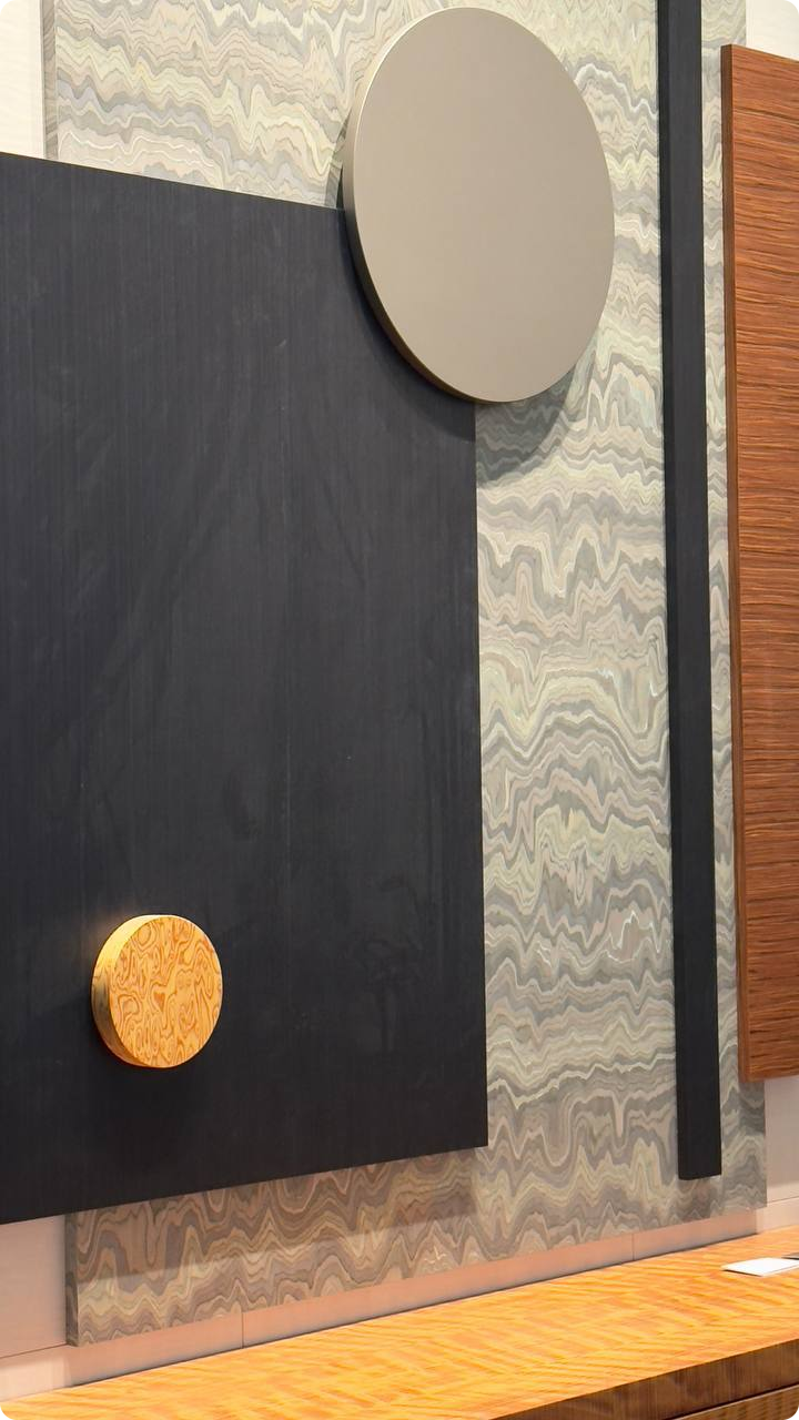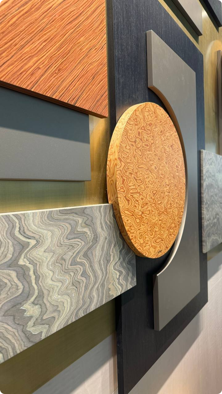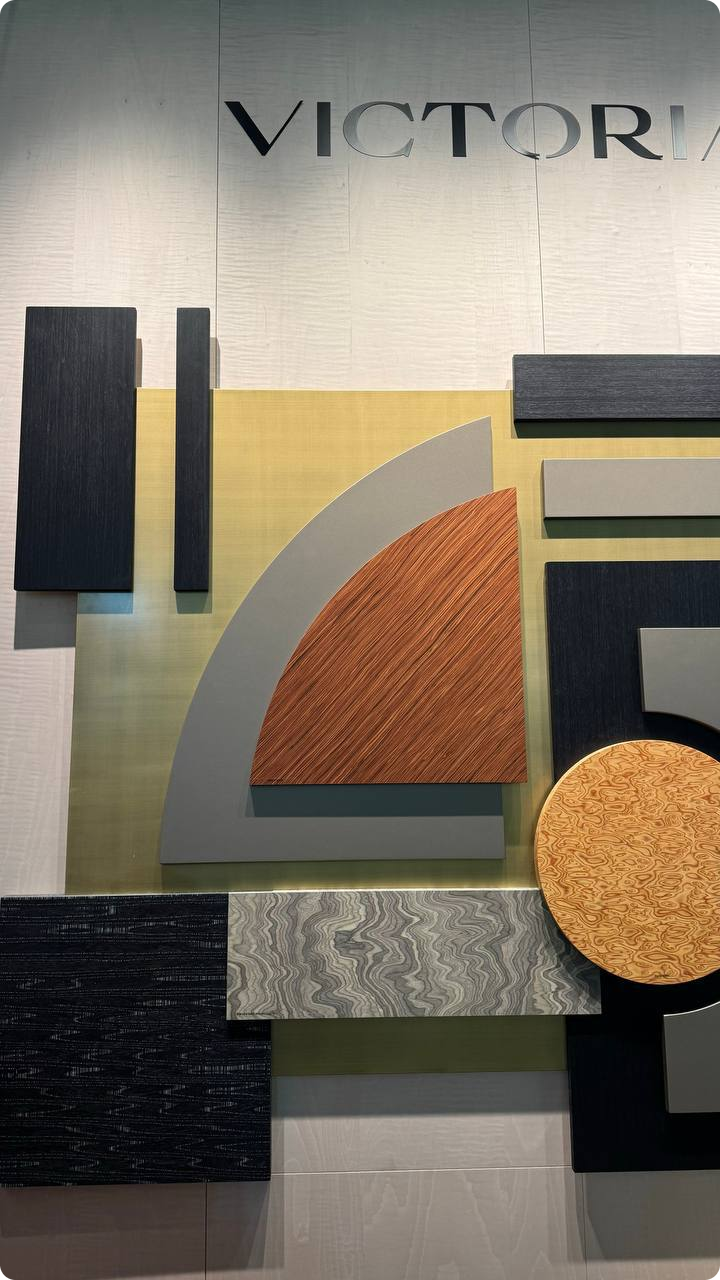 ✅Мультишпон из 3-х коллекций, который представлен на панно. В отдельности материалы достаточно активны, но вместе обрели абстрактную гармонию