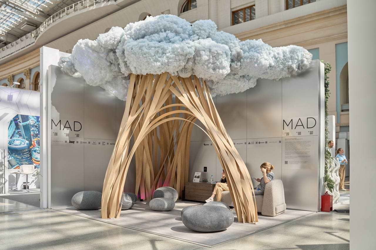 В рамках ХХIX Международной выставки – форума архитектуры и дизайна Арх Москва 2024 бюро MAD Architects представило собственное прочтение центральной темы выставки, которая в этом году звучала как «ПОЛЬЗА». Команда черпала вдохновение в природном процессе иноскуляции – переплетении и сращивании ветвей деревьев под воздействием окружающей среды. Поэтому центральным элементом стенда стало дерево, сплетенное из лент натурального шпона, увенчанное «световыми облаками».