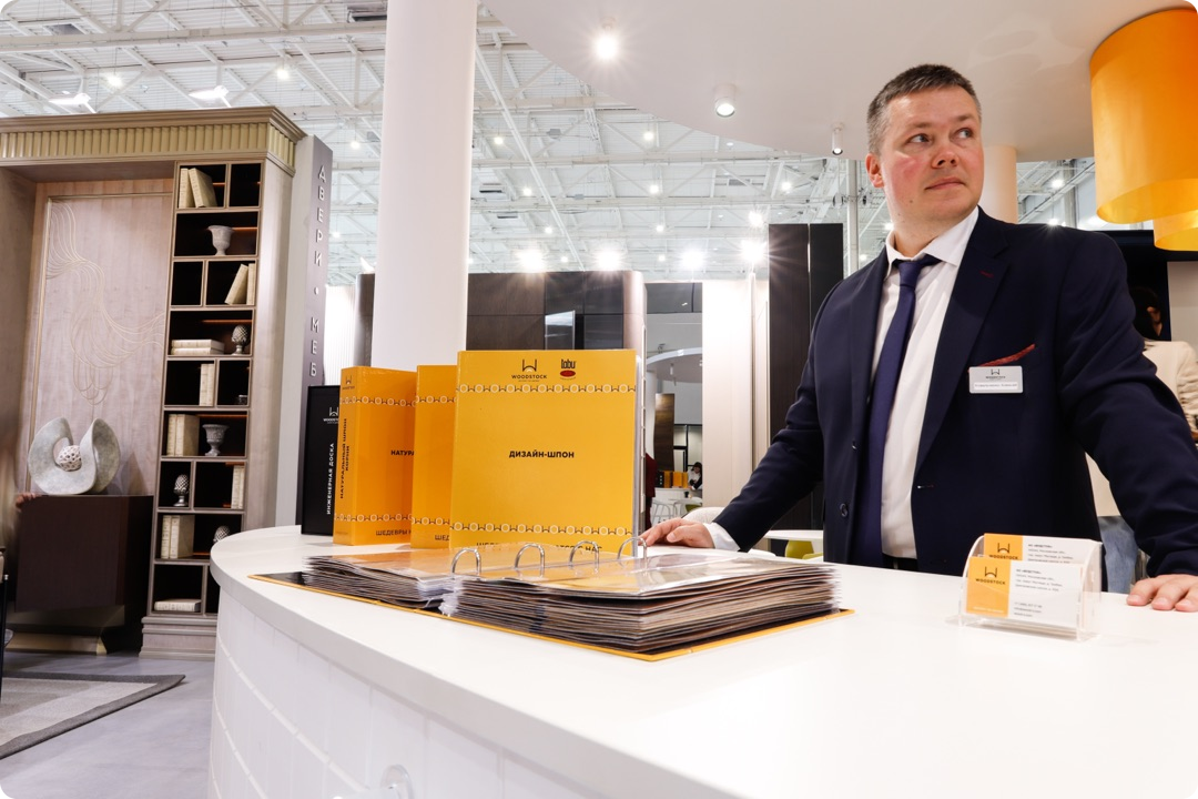 - Для оформления стенда мы предоставили натуральный шпон WOODSTOCK - Имбайя