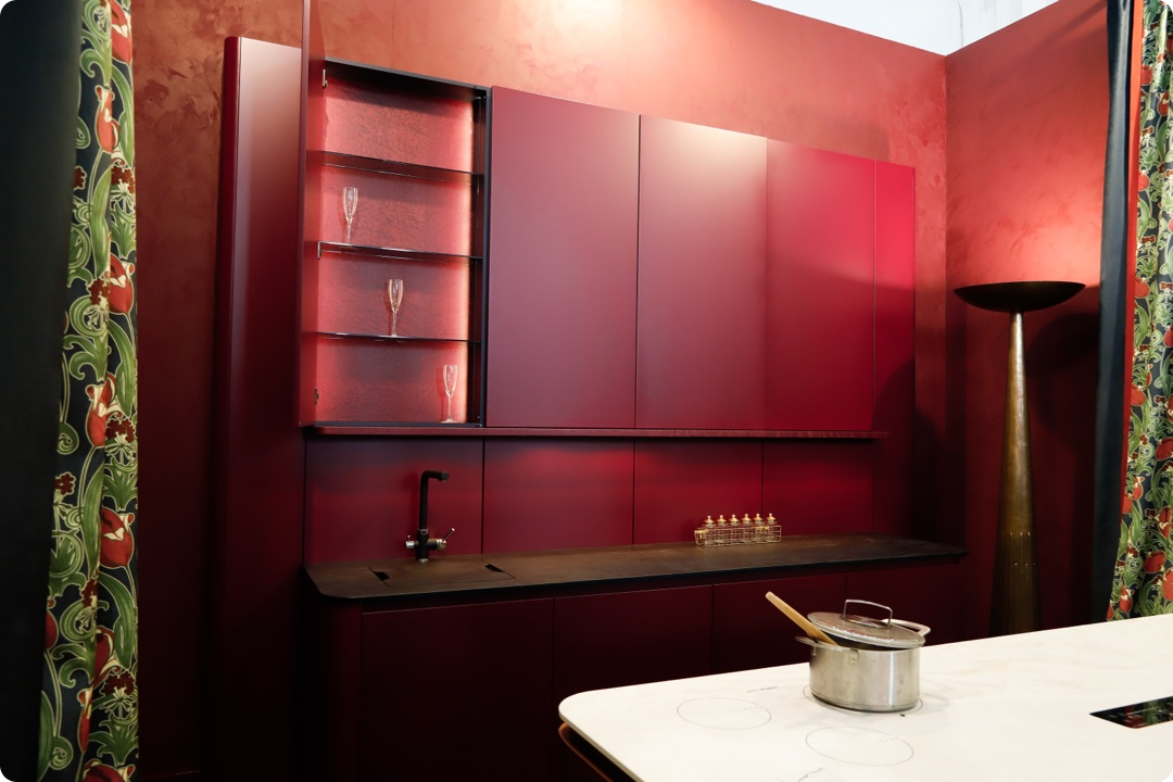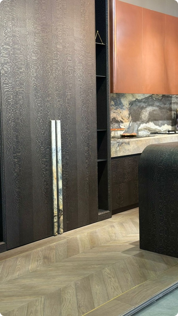 Ярким элементом экспозиции стал дизайн-шпон Лайсвуд 81.063 от WOODSTOCK. Его глубокий оттенок и природный узор придали мебели фактурность и объём.