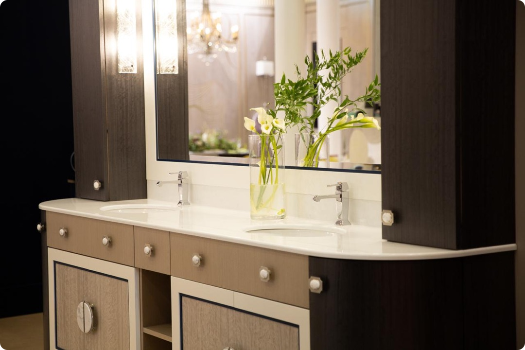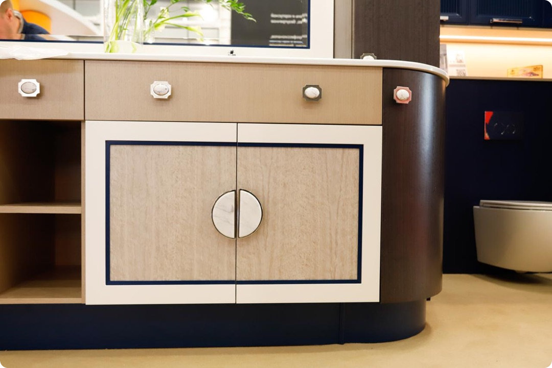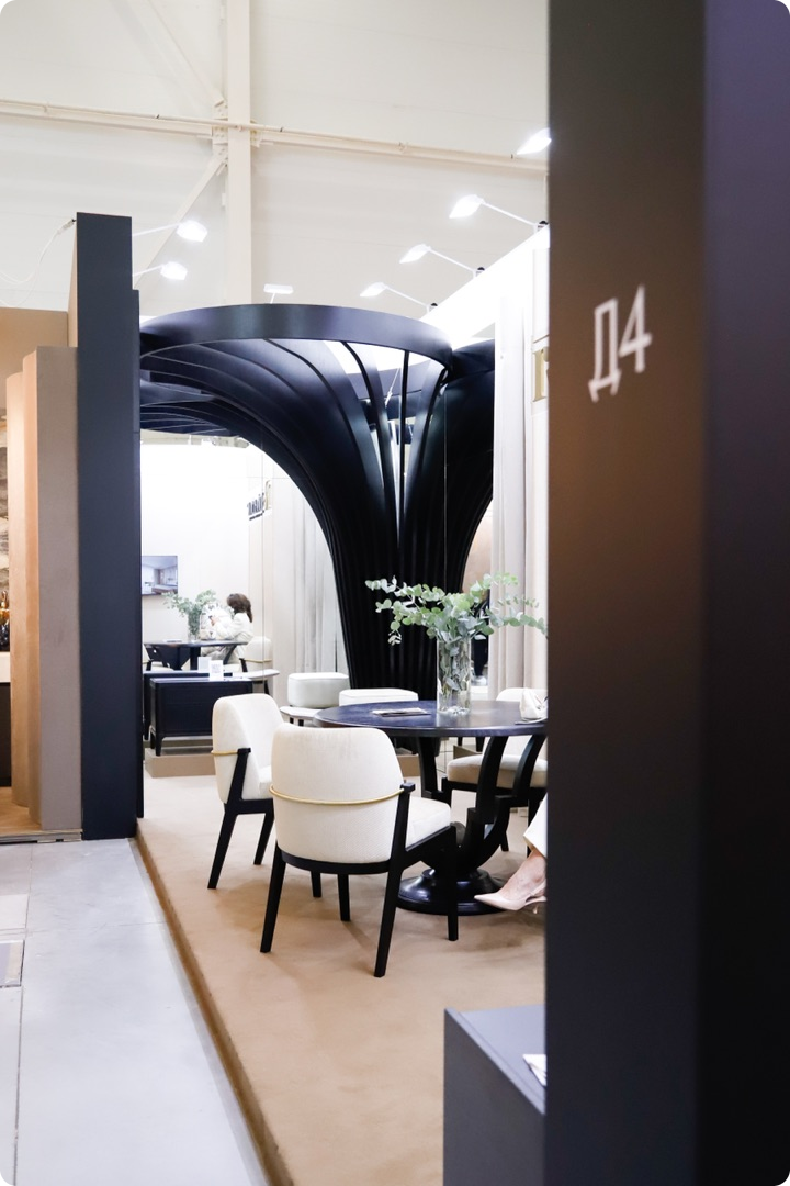 Эти решения подчеркнули фактуру фасадов, добавили глубину и гармонию в интерьер экспозиции. Именно они задали стиль и характер мебели, представленной на стенде.