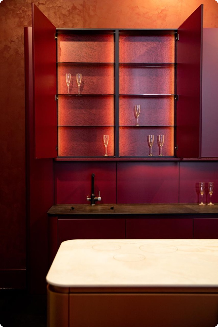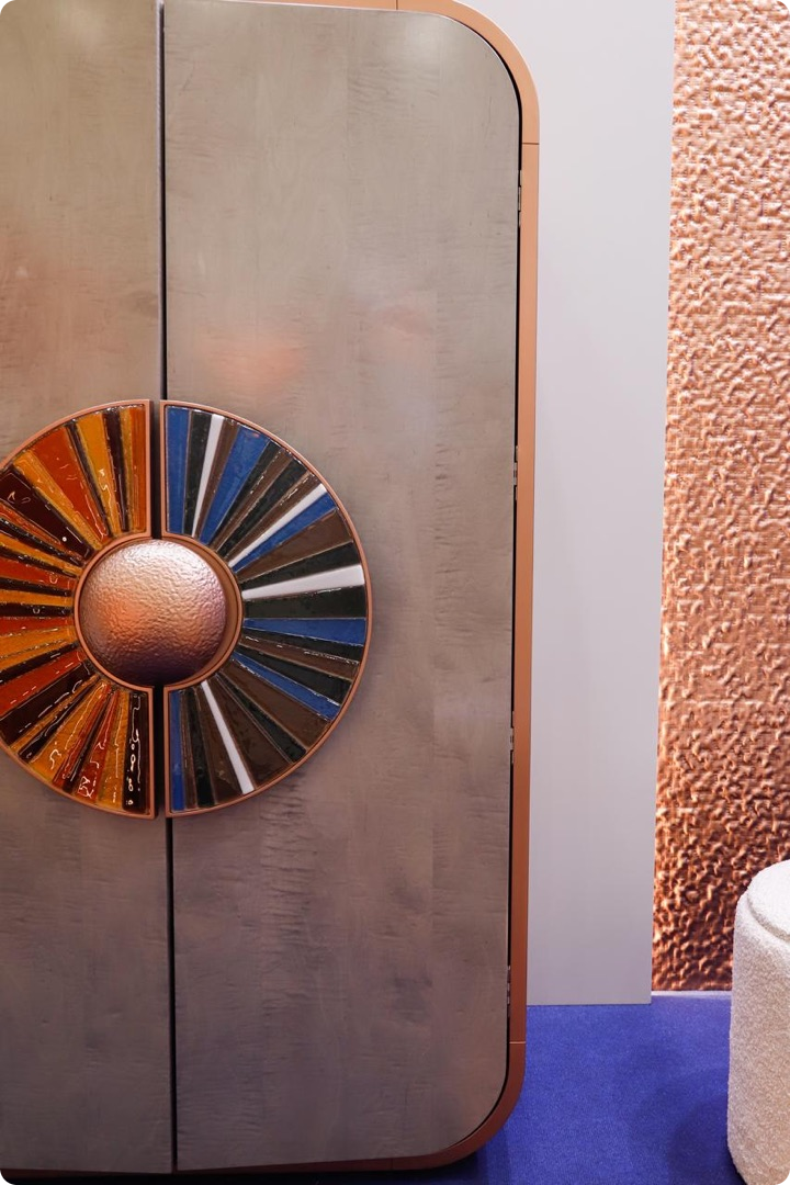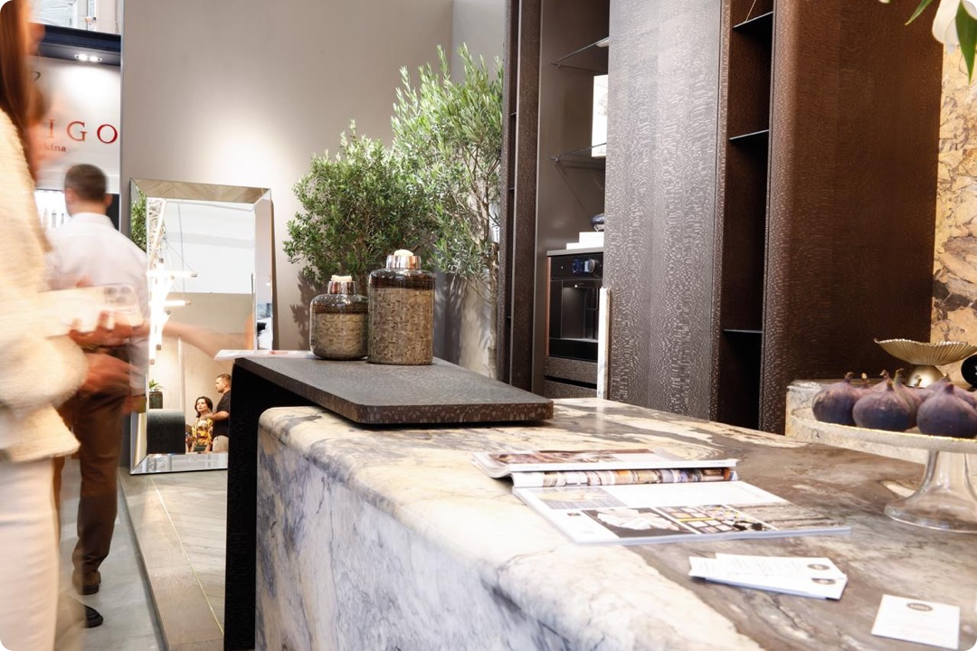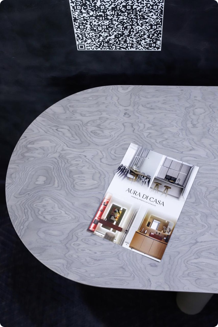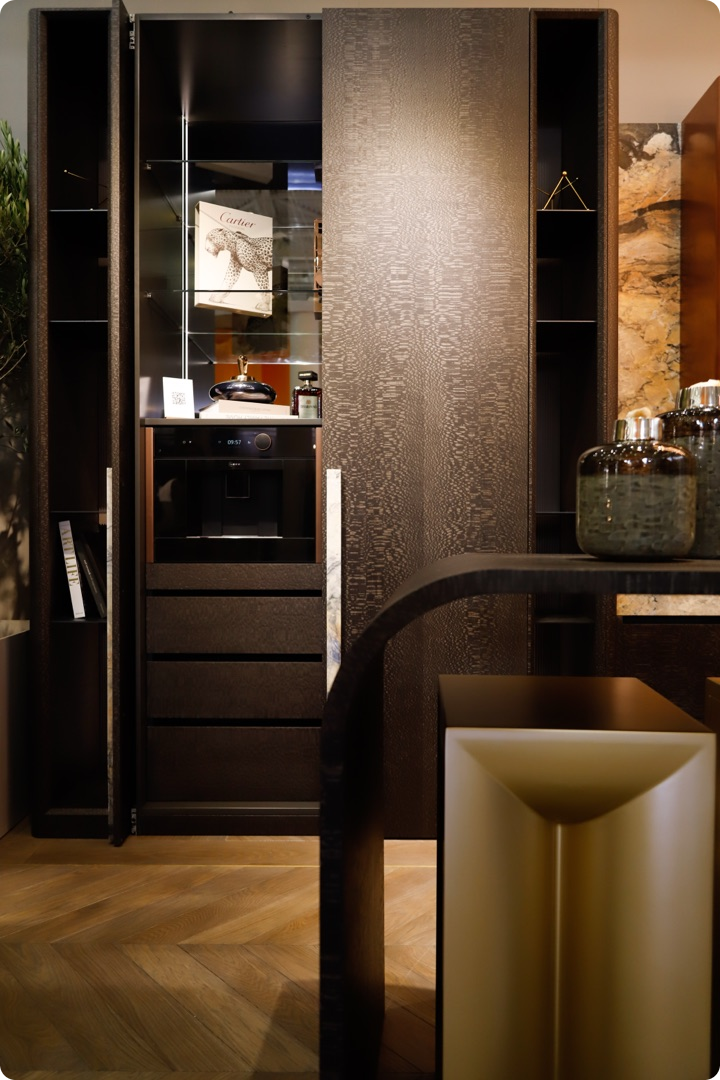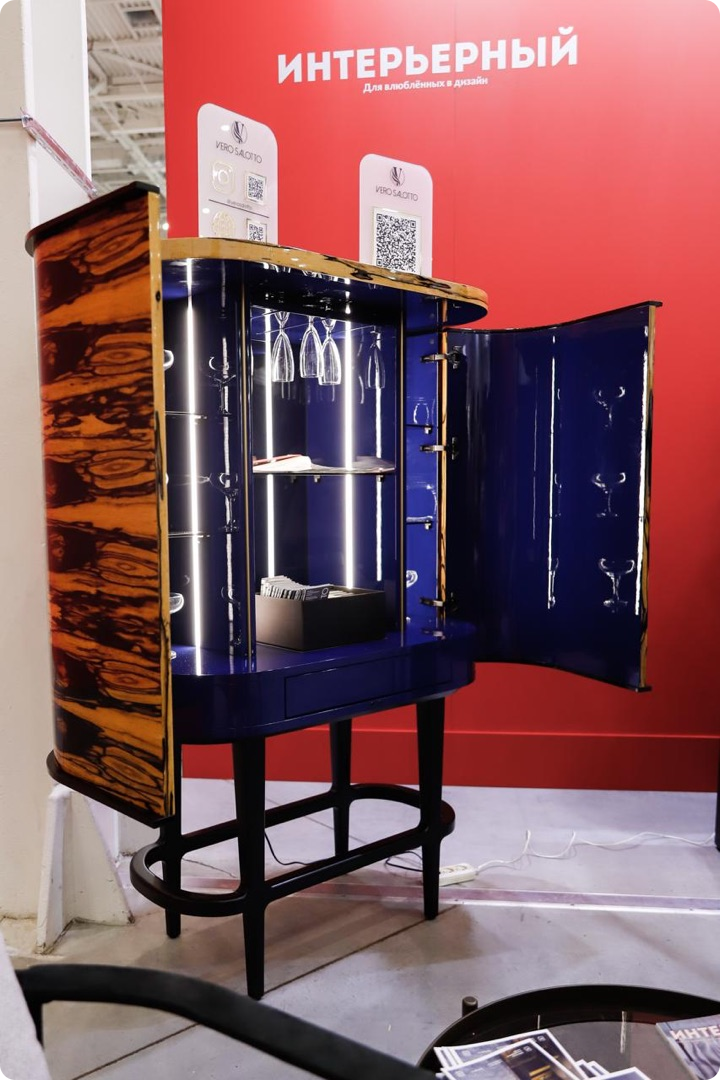 Ярким элементом экспозиции стал дизайн-шпон Лайсвуд 81.063 от WOODSTOCK. Его глубокий оттенок и природный узор придали мебели фактурность и объём.