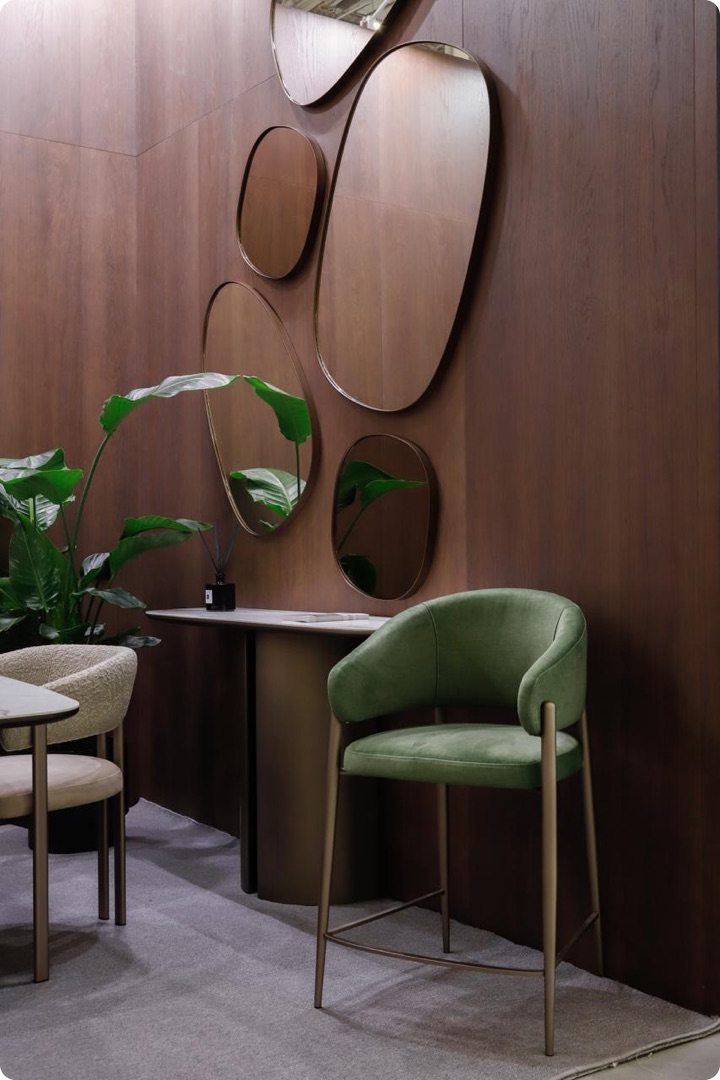 Благодаря мягкой текстуре и глубокому цвету Имбайя создаёт ощущение уюта и гармонии, подчёркивая природный характер пространства. Экспозиция полностью передаёт идею бренда: интерьер как пространство для вдохновения, где каждая деталь имеет значение.