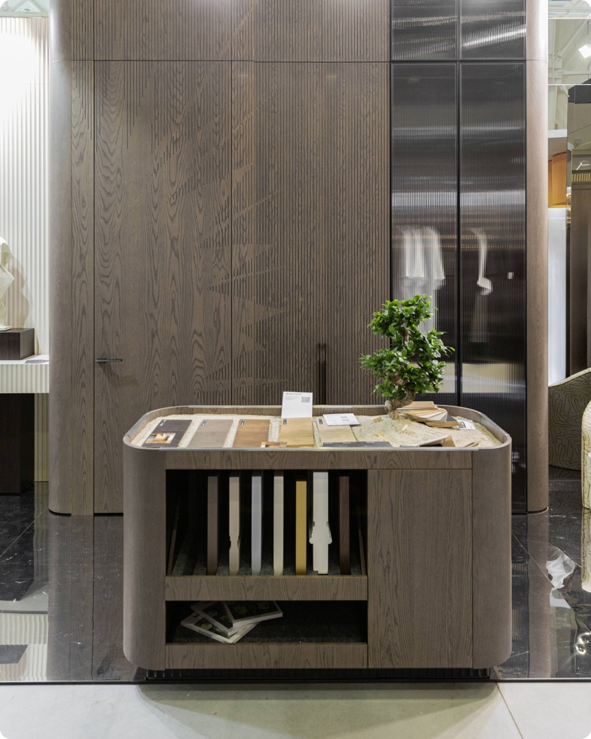В экспозиции использованы Мультишпон и Натуральный шпон Дуба в тонировке от WOODSTOCK - эти материалы задали атмосферу глубины и сдержанной элегантности